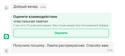 Если имела место переписка с другим пользователем по поводу сделки на Куфаре, вы можете оценить друг друга: