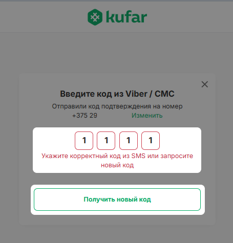 Если вы видите такое сообщение, значит, код был введён неверно. Проверьте ещё раз полученный код и введите его снова. В случае повторного появления этой ошибки повторно запросите код, нажав на надпись «Получить новый код»