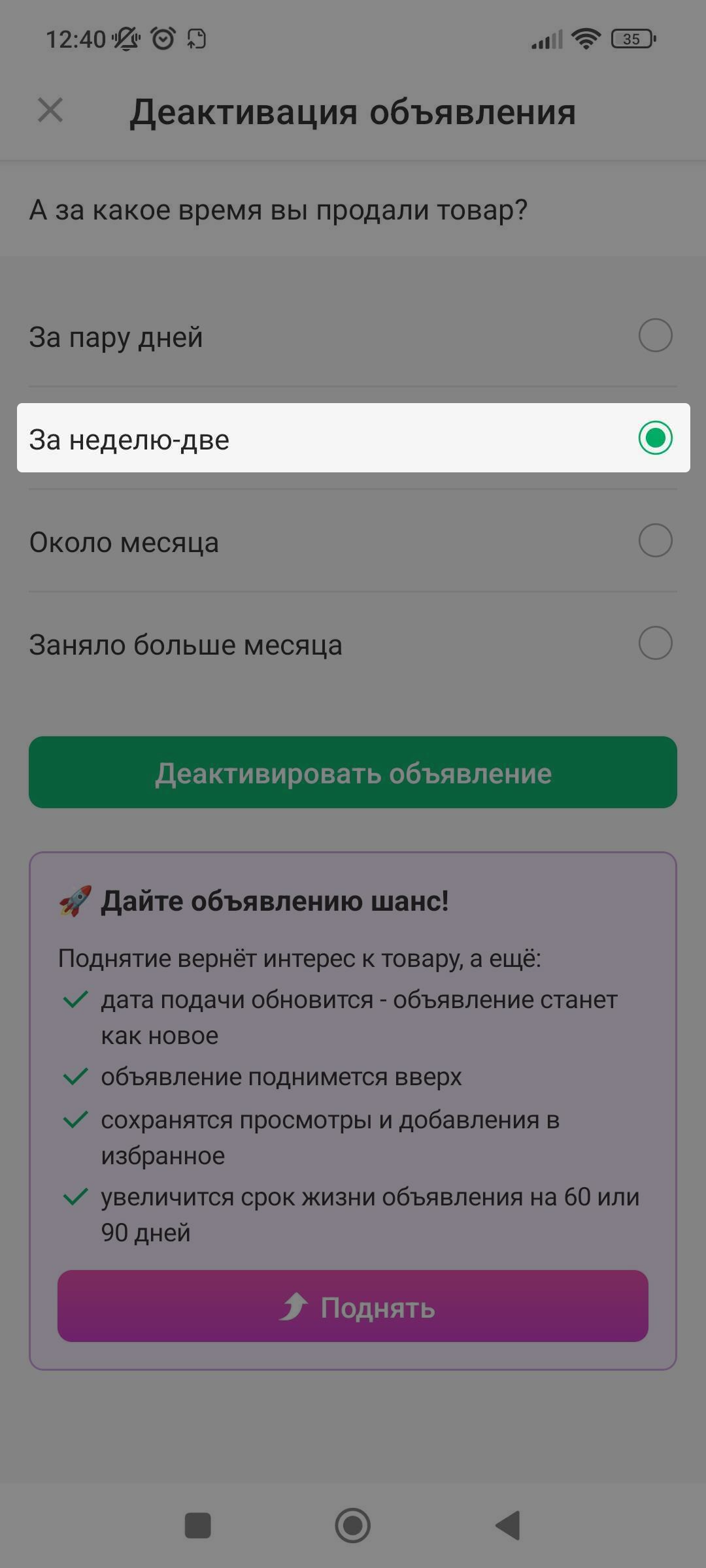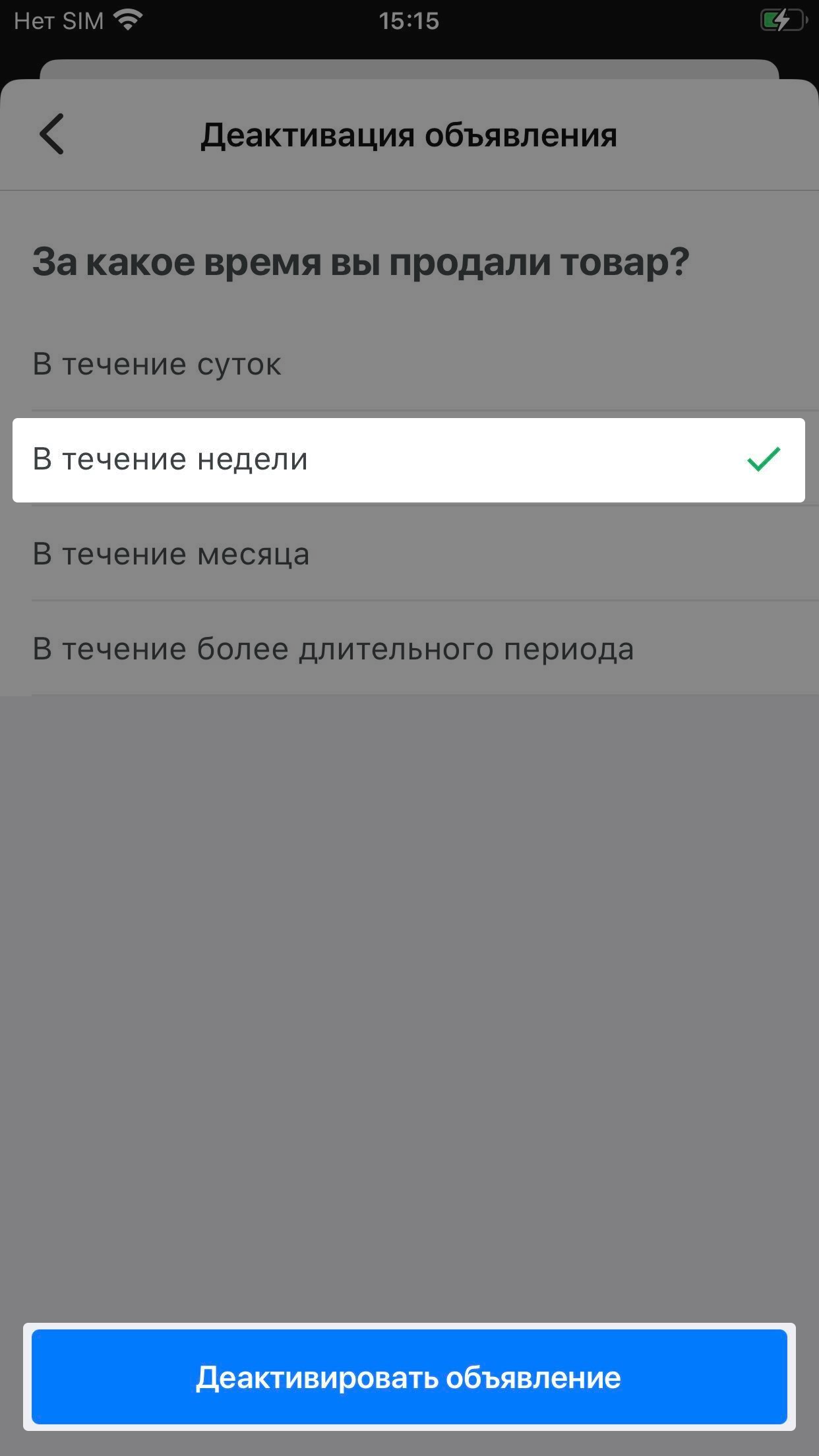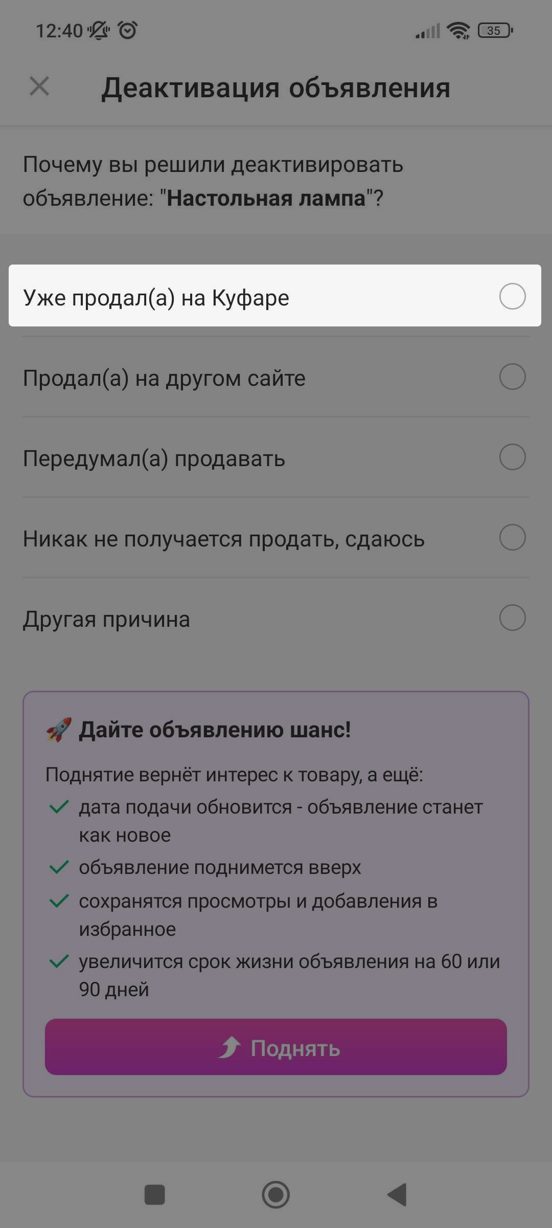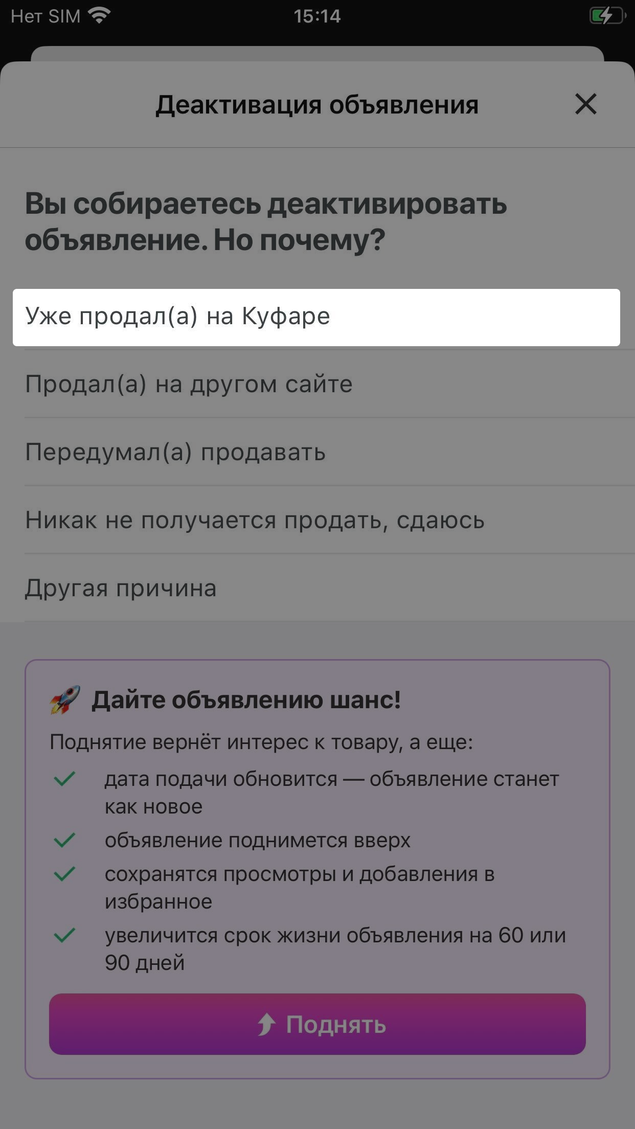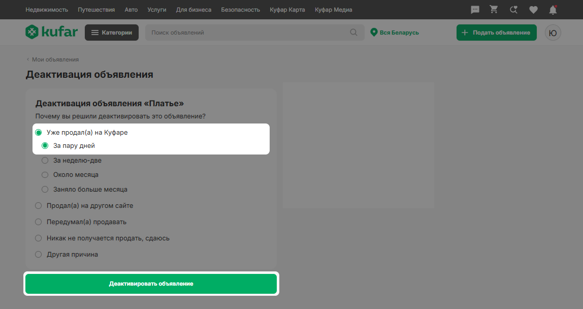 2. Выбрать причину деактивации "Уже продал (-ла) товар на Куфаре".