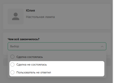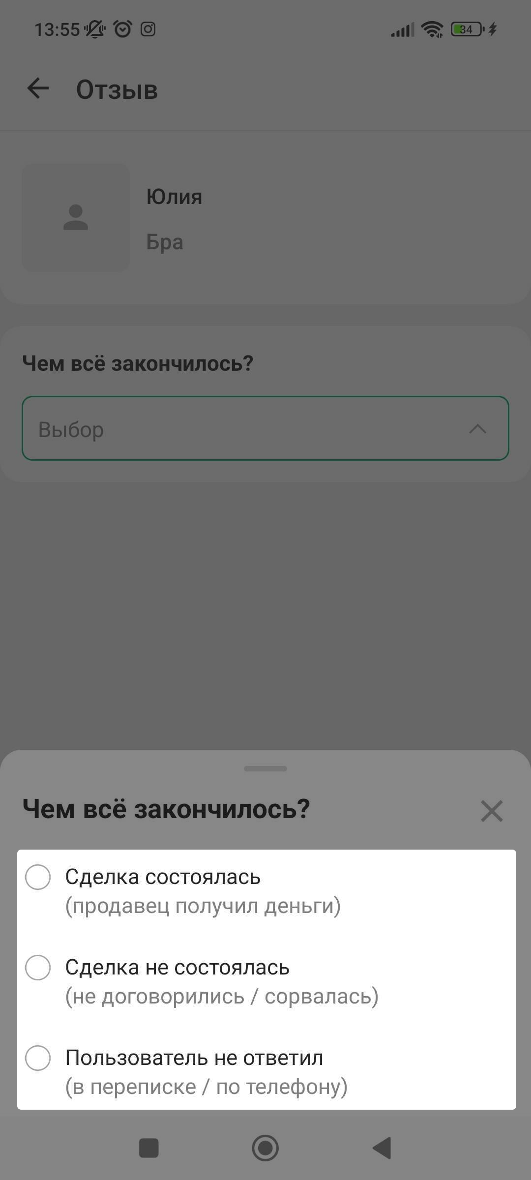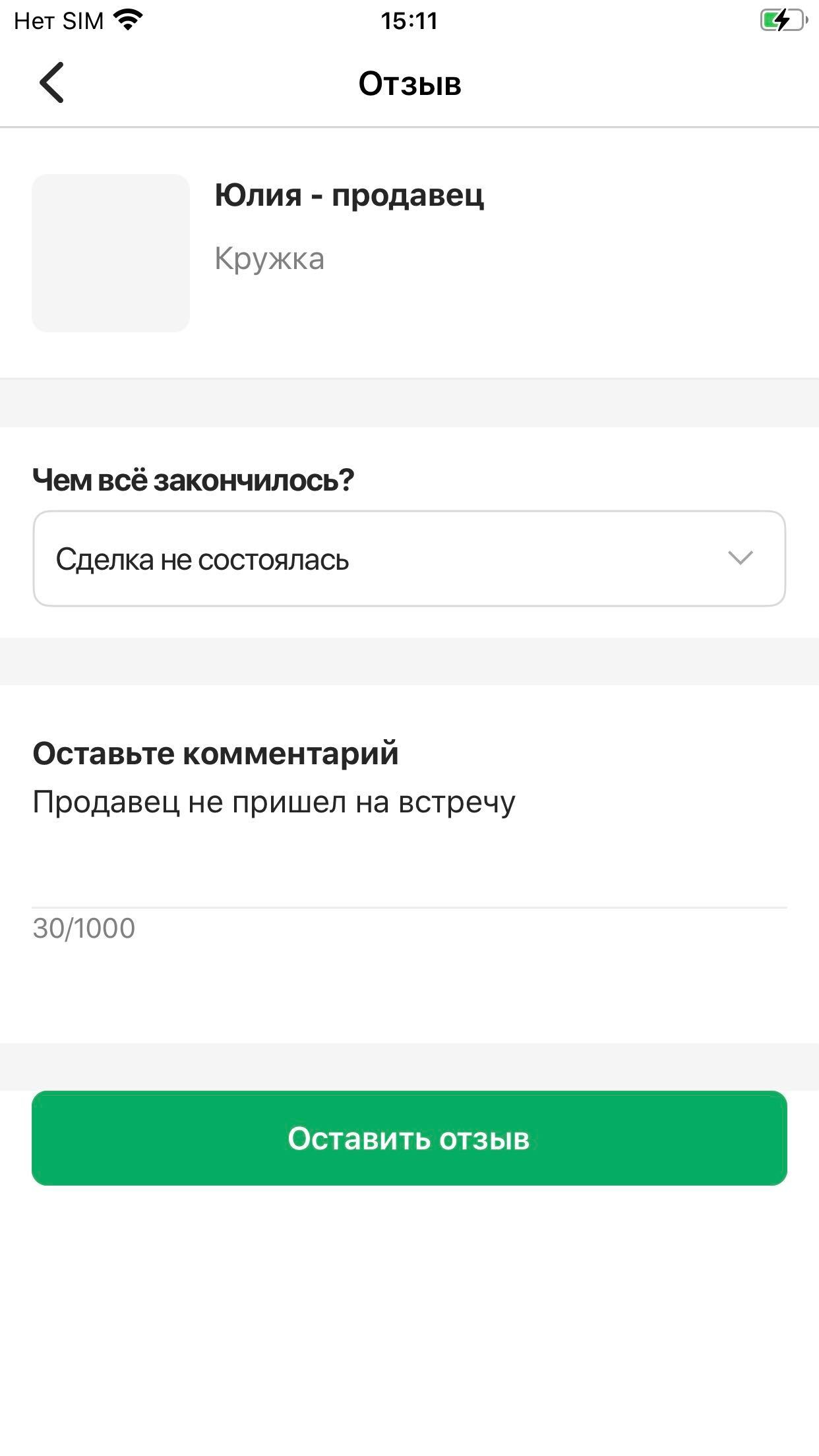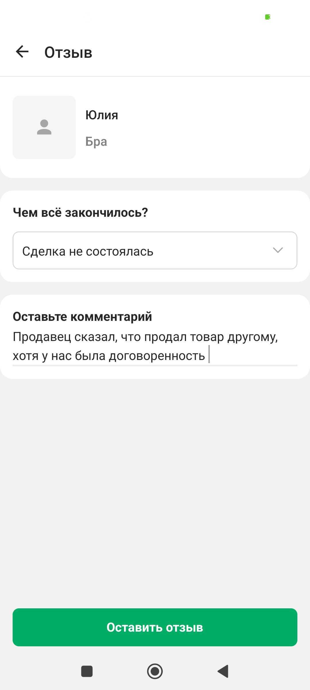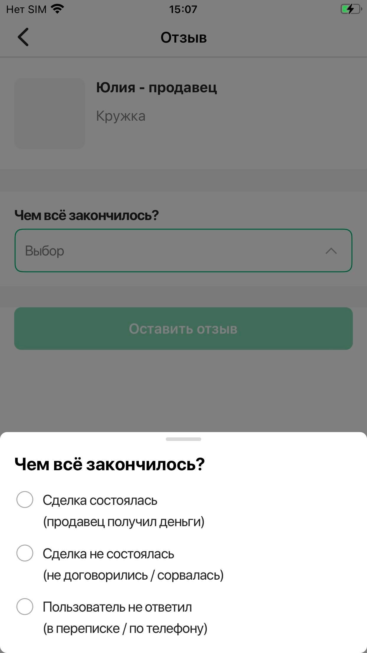 Если сделка не состоялась и вы хотели бы оценить только общение, выбирайте подпункт «Сделка не состоялась» или «Пользователь не ответил». Тогда вы сможете оставить только отзыв о продавце без оценки.