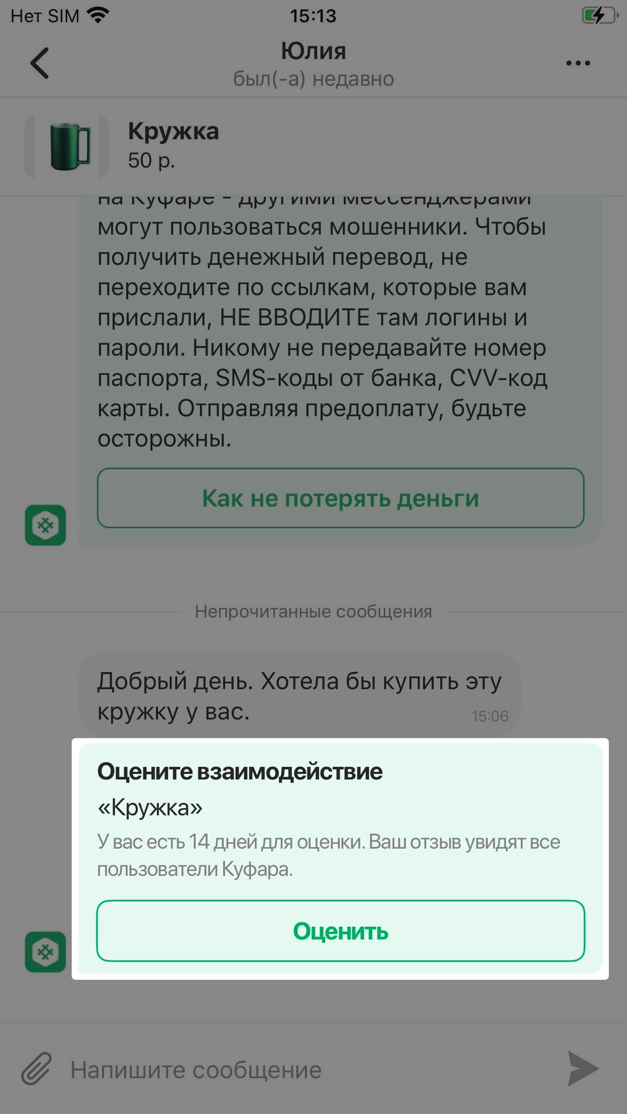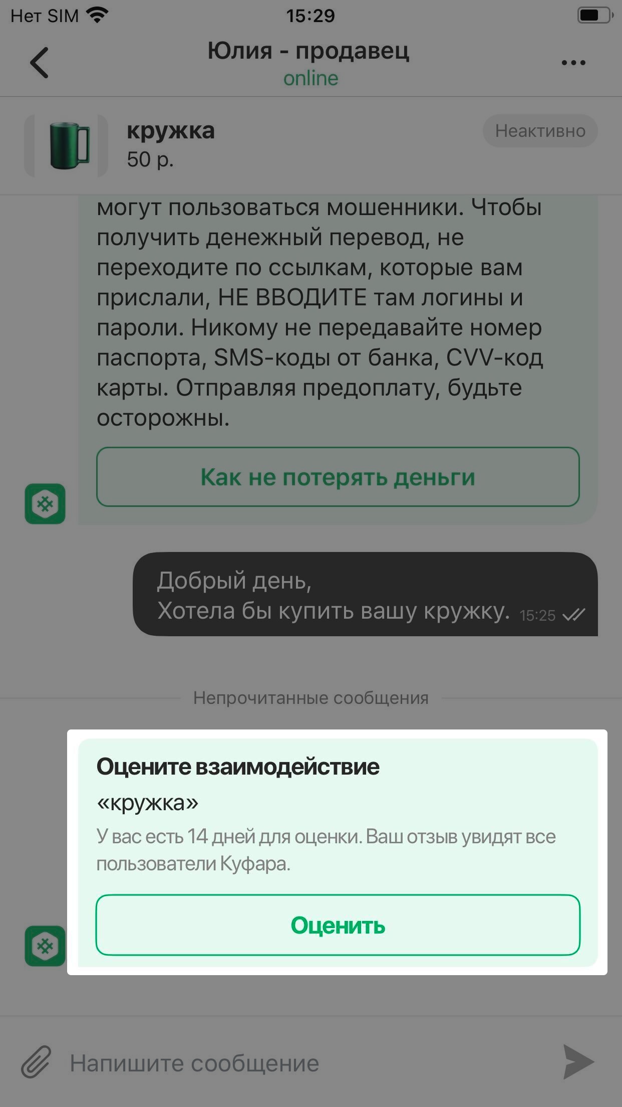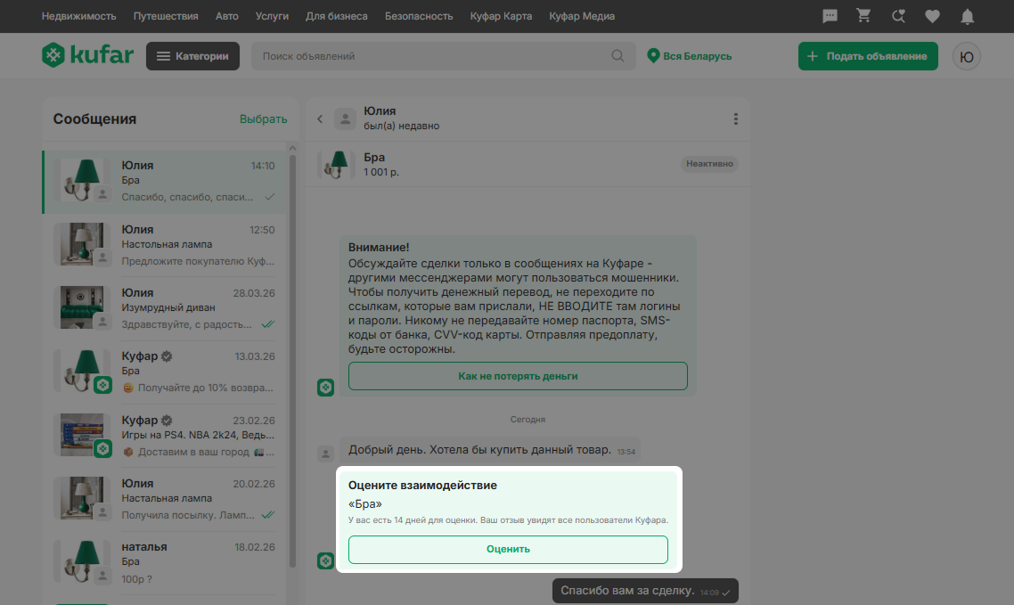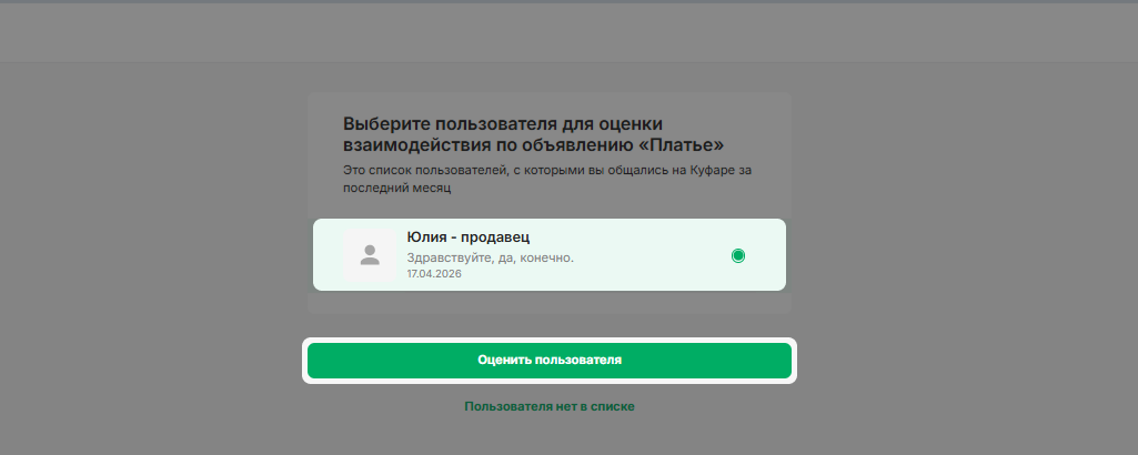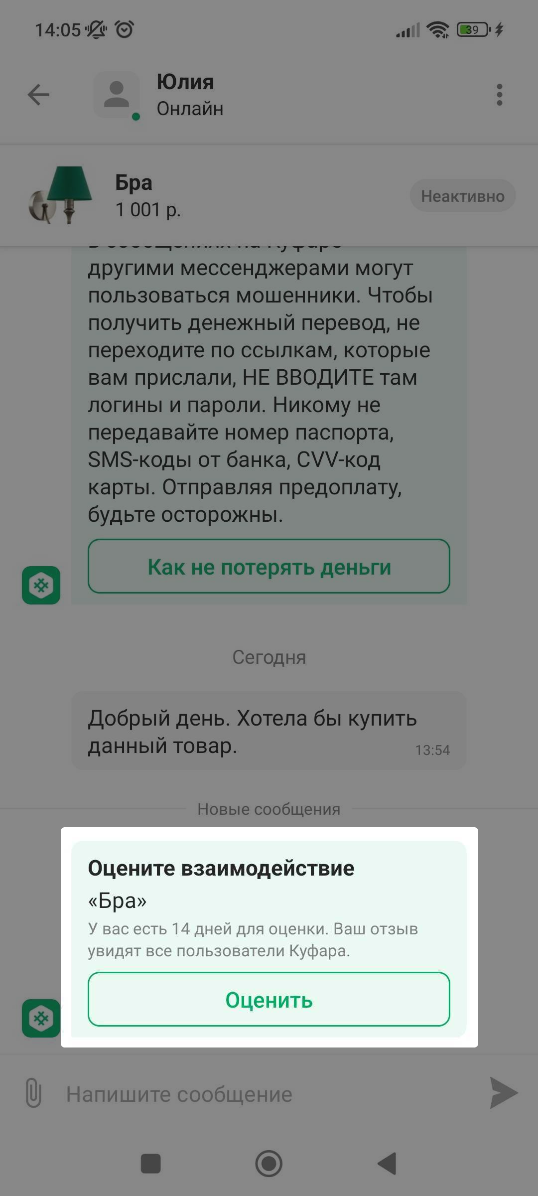 ✅ Если продавец деактивировал объявление, по которому имела место переписка на Куфаре и выбрал вас покупателем. В таком случае вам придет запрос на оценку продавца в вашу с ним переписку на Куфаре.