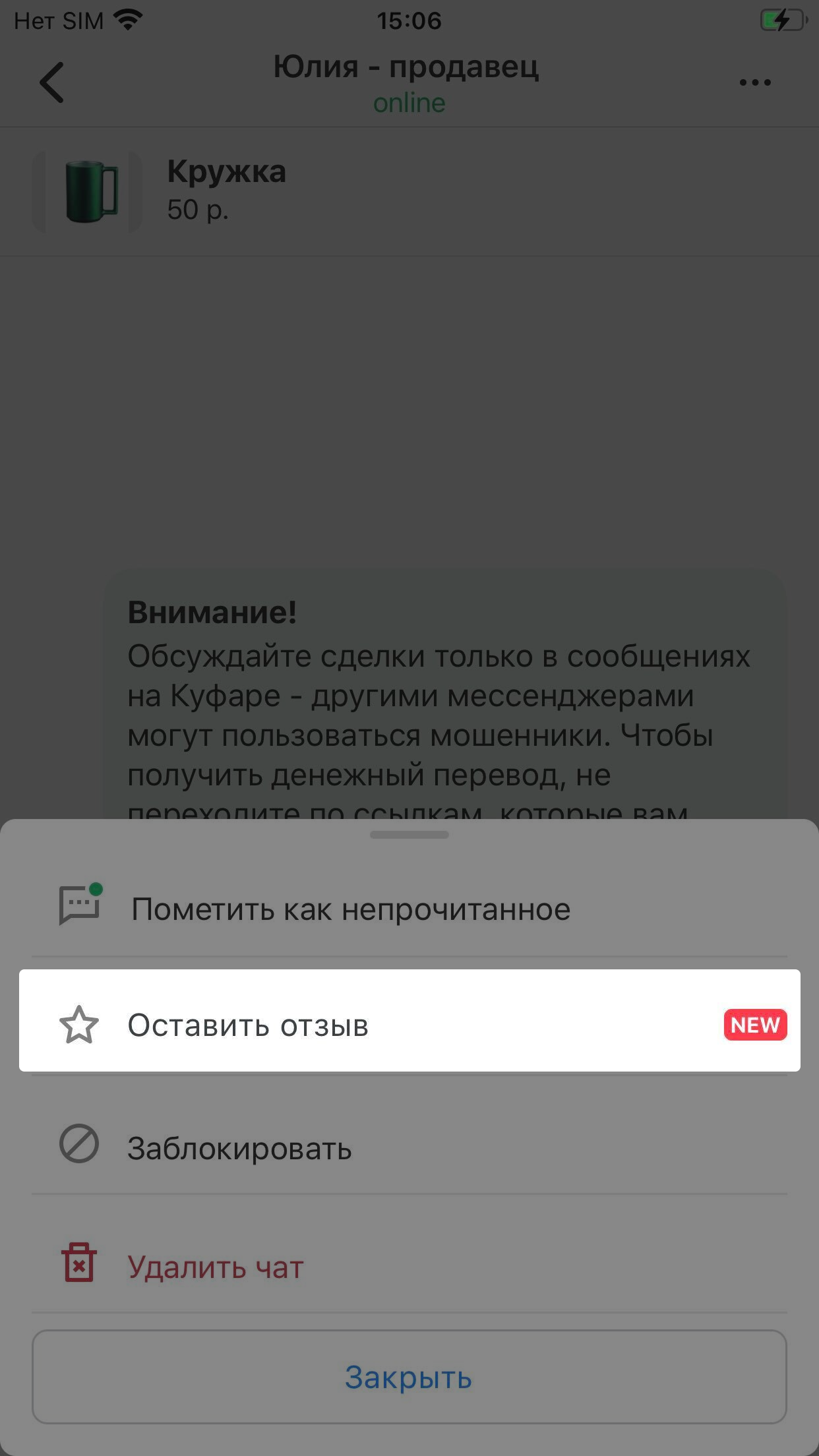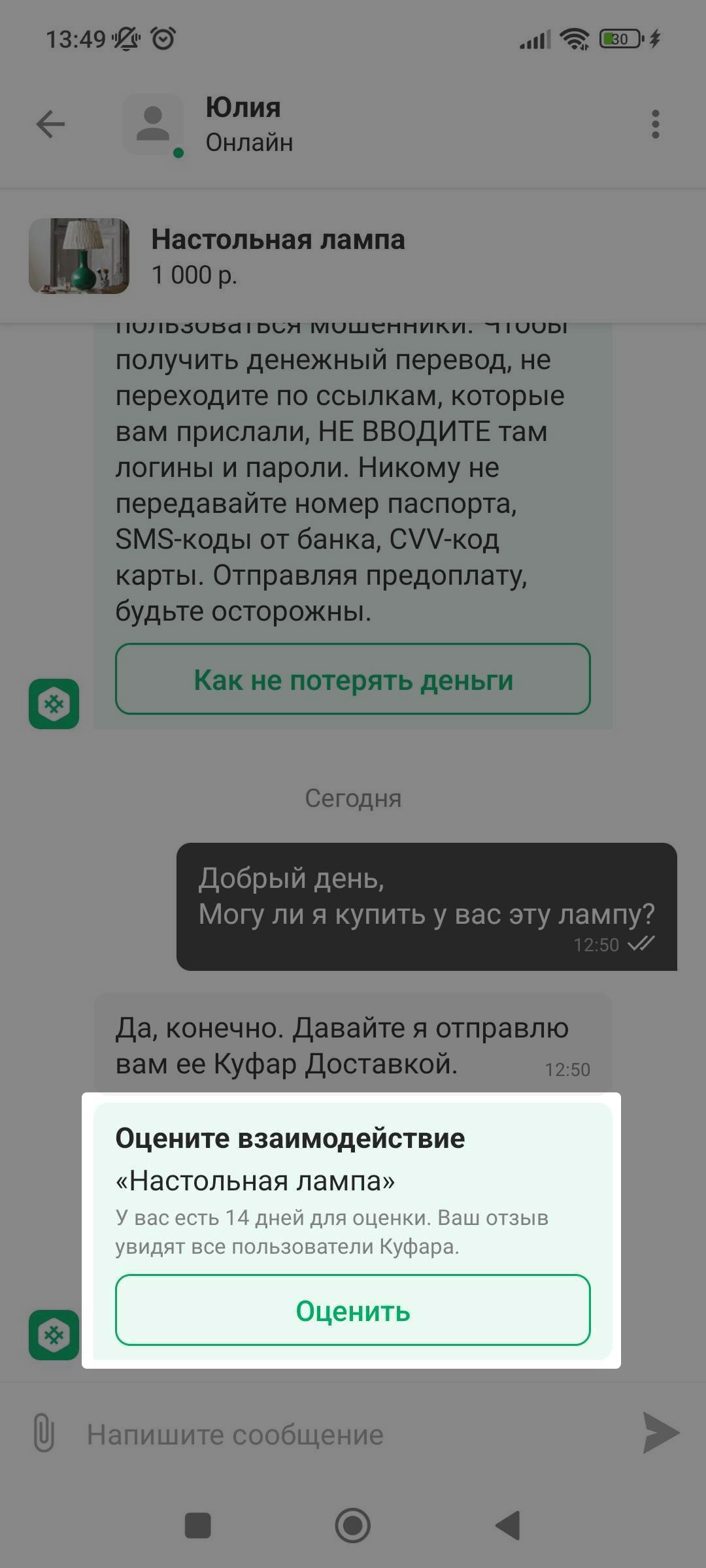 ✅ Если покупатель выбрал опцию «Оставить отзыв» - подпункт «Сделка состоялась» в переписке с продавцом. В таком случае вам придет запрос на оценку в вашу с ним переписку на Куфаре.